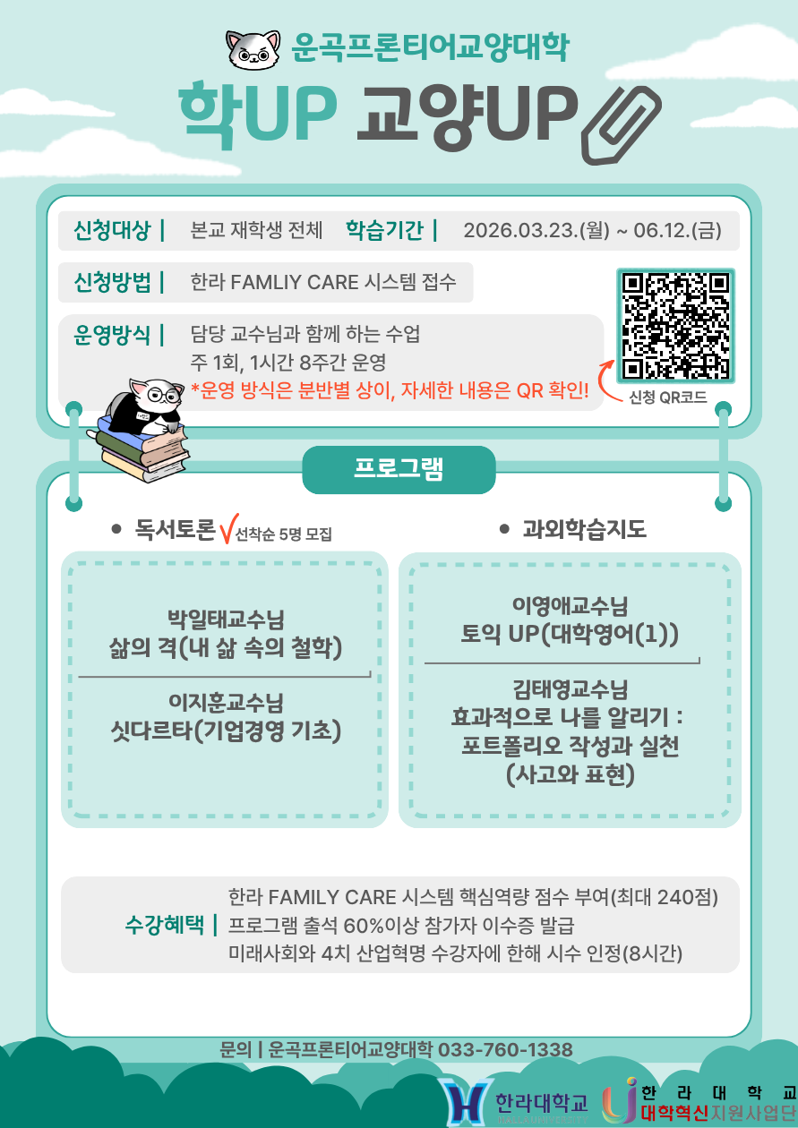 2026학년도 1학기 운곡프론티어교양대학에서는 아래와 같이 학UP 교양UP을 운영하고자 합니다. 많은 관심 바랍니다.