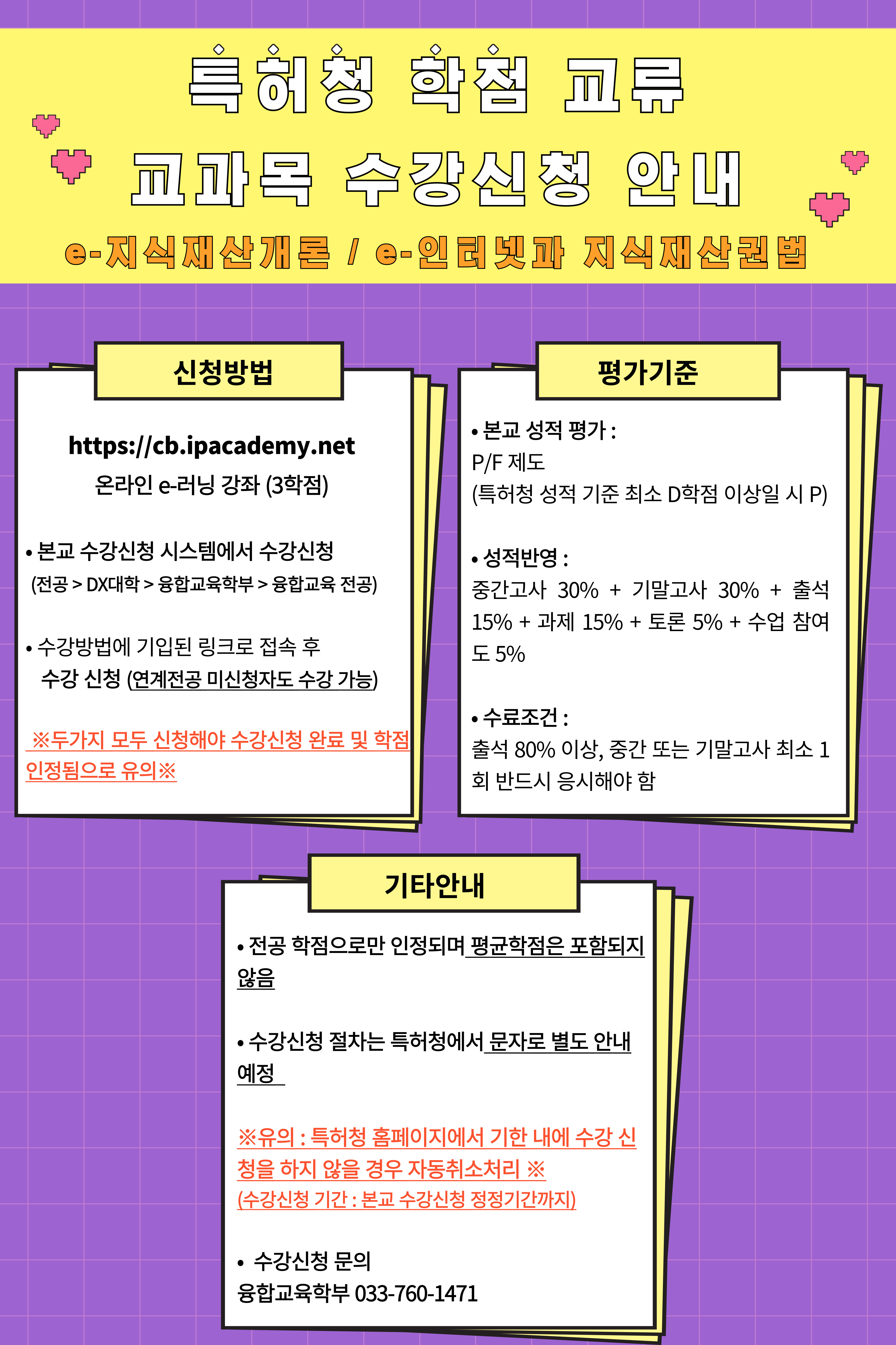 특허청 학점교류 교과목(e-지식재산개론, e-인터넷과 지식재산권법) 수강신청 관련 안내