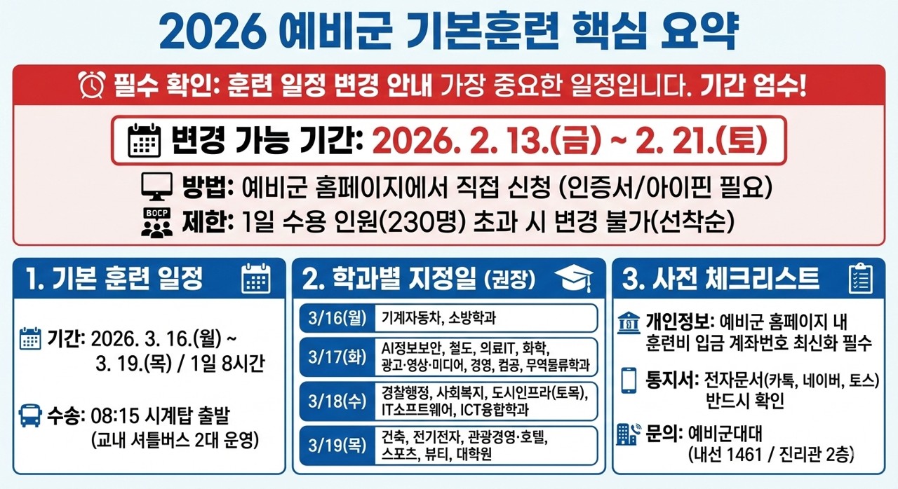 학과별 훈련 일정은 입력되어 있으며, 변경(개인, 변경기간)은 가능합니다. 인원수를 고려하여 편성하였기 때문에 특별한 사항이 없으면 해당 일에 훈련하시길 당부드립니다.
