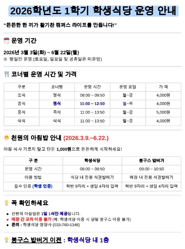 2026년도 1학기 학생식당 및 천원의 아침밥 운영 안내