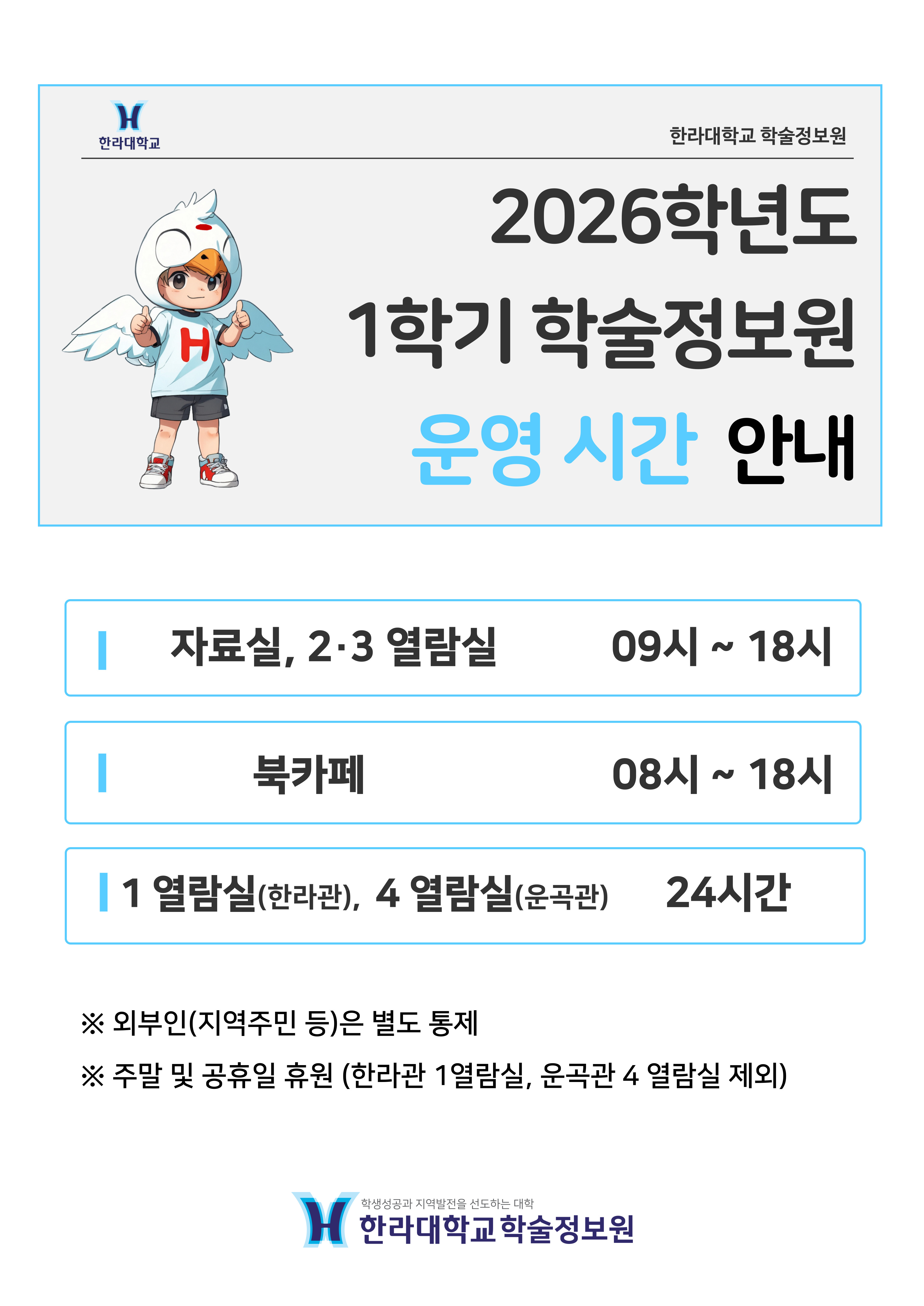 2026학년도 1학기 학술정보원 운영시간을 안내하오니 이용에 참고하시기 바랍니다.